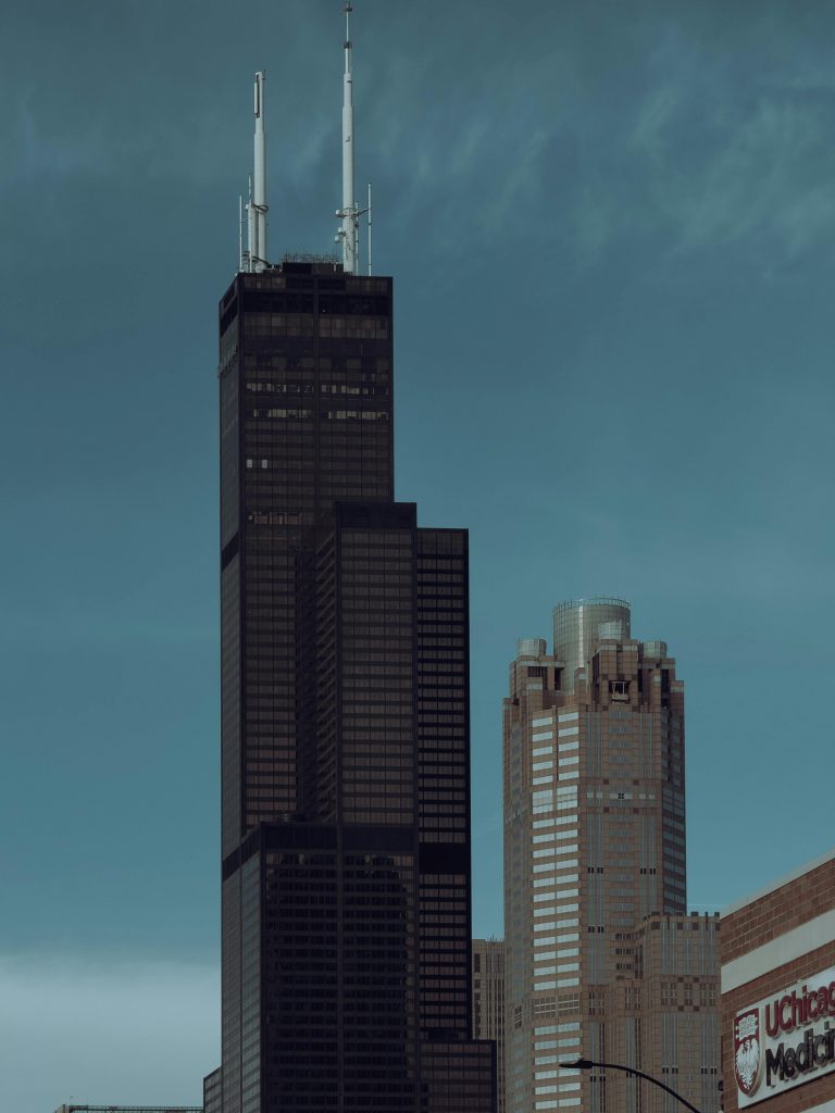 - La Willis Tower, antes conocida como Sears Tower, es uno de los símbolos más icónicos de Chicago. Con 442 metros de altura (y hasta 527 metros si contamos las antenas), fue el edificio más alto del mundo durante 20 años. Construida entre 1971 y 1973 por Skidmore, Owings & Merrill, su diseño con nueve “tubos” cuadrados descendentes permite una silueta inconfundible. Originalmente albergaba a miles de empleados de Sears y, aunque cambió de nombre en 2009, los locales siguen llamándola “Sears Tower”.. Web oficial aquí.