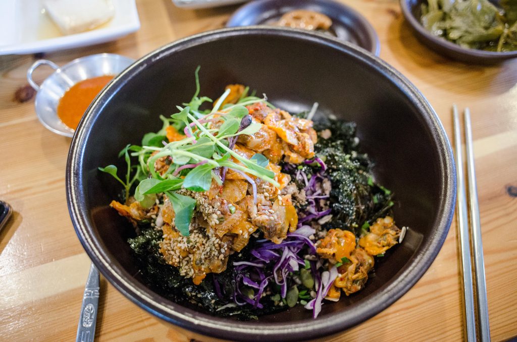 Bibimbap: un plato lleno de color y sabor, que combina arroz, verduras, carne (opcional) y huevo, aderezado con gochujang, la salsa de chile coreano. Es perfecto para quienes buscan un plato completo y nutritivo. 🍚🥕